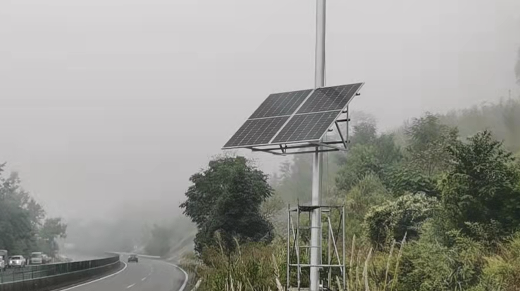坐標:貴州??!美麗貴州,美麗畢節,這個項目是太陽能供電系統在貴州省視頻加密高速公路上的應用,主要給監控攝像機和傳輸交換機設備供電,本項目采用了單塊545W的光伏組件,共2塊,組成1090W的太陽能光伏組件,控制器采用華昱信通MPPT高功率版的控制器,電池采用磷酸鐵鋰電池51.2v100AH,代替了傳統的鉛酸膠體電池,磷酸鐵鋰電池充電快,體積小,電池循環次數多,使用壽命更長,對高速公路連續陰雨天的效果比傳統方式有了明顯進步。